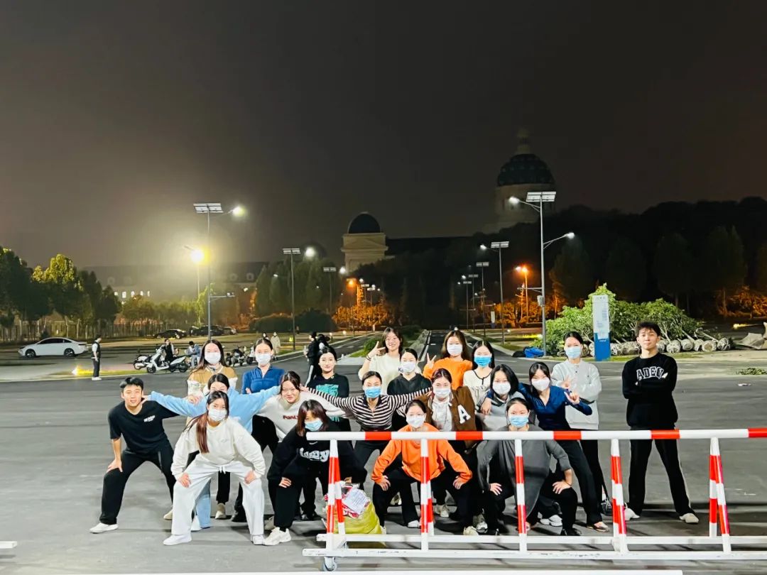 台上一分钟,台下十年功。为了出色完成表演,每一个动作都要到位,每一个细节都要记好。一次次的反复练习,只为最终呈现整齐划一的效果。夜幕降临,伴着十一月的秋风,披着夜晚的月光,啦啦操队员仍在抓紧时间,刻苦训练。因疫情原因,杨岚老师夜晚隔着大门围栏指挥队员动作、框架、队形、节奏,赵佳慧老师上课之余也在微信群里仔细审阅队员们的训练视频,一个一个地用心指导,强化细节,给同学们加油打气。