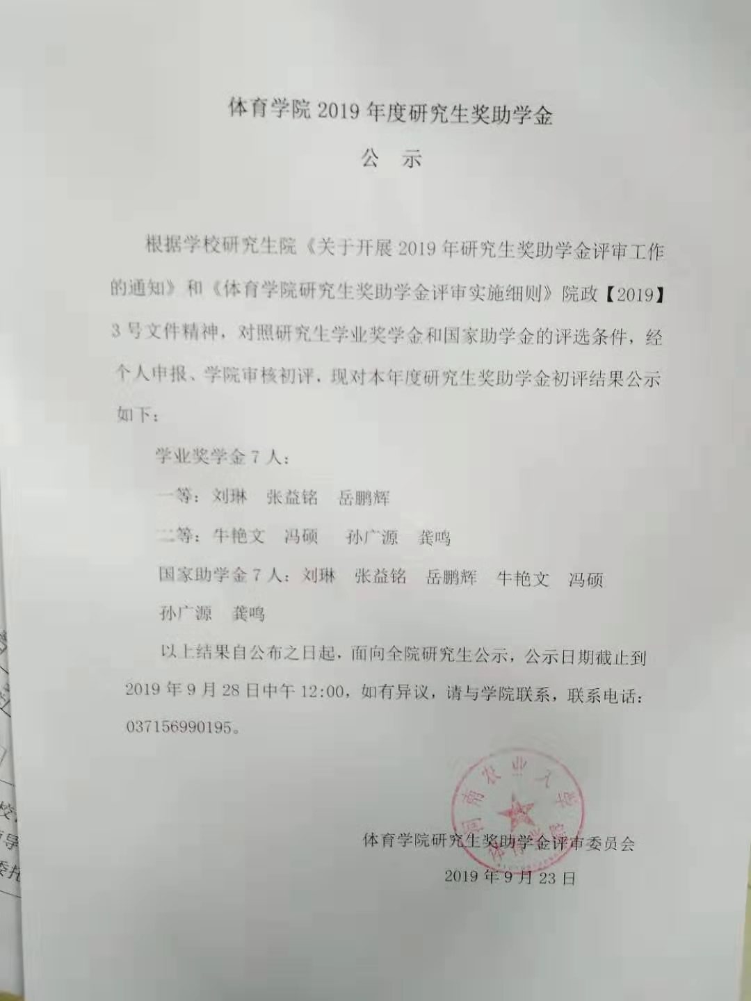 根据博彩游戏 研究生院《关于开展2019年研究生奖助学金评审工作的通知》和《博彩游戏 研究生奖助学金评审实施细则》院政【2019】3号文件精神,对照研究生学业奖学金和国家助学金的评选条件,经个人申报、博彩游戏 审核初评,现对本年度研究生奖助学金初评结果公示如下: