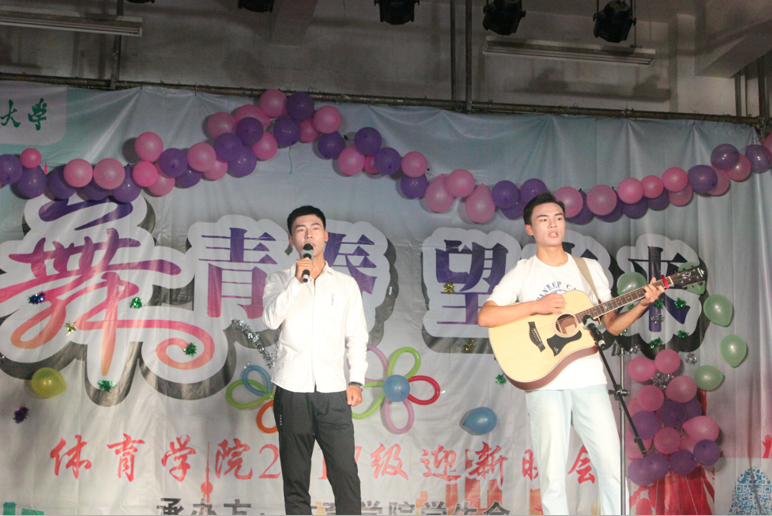 博彩游戏 16级学生在晚会上弹唱《光辉岁月》,给2017级新生送去祝福。