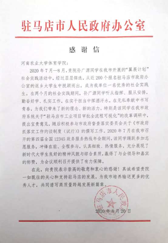 8月20日,驻马店市政府办公室给博彩游戏 发来感谢信,对博彩游戏 培养优秀人才表示感谢。