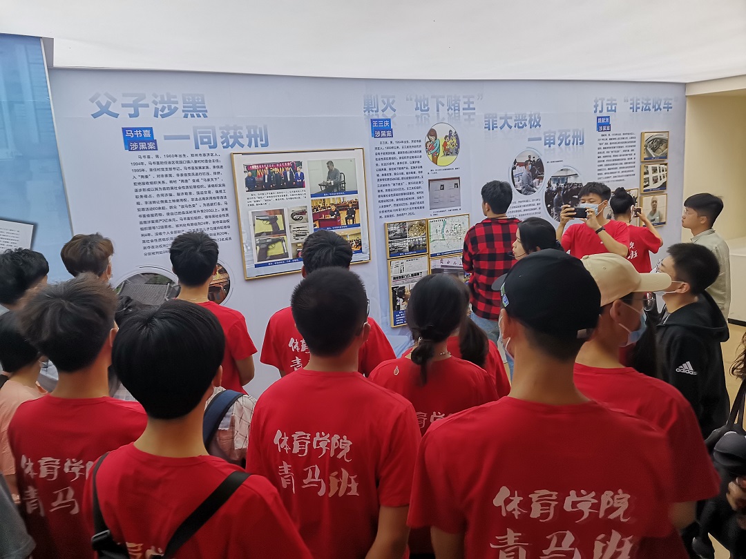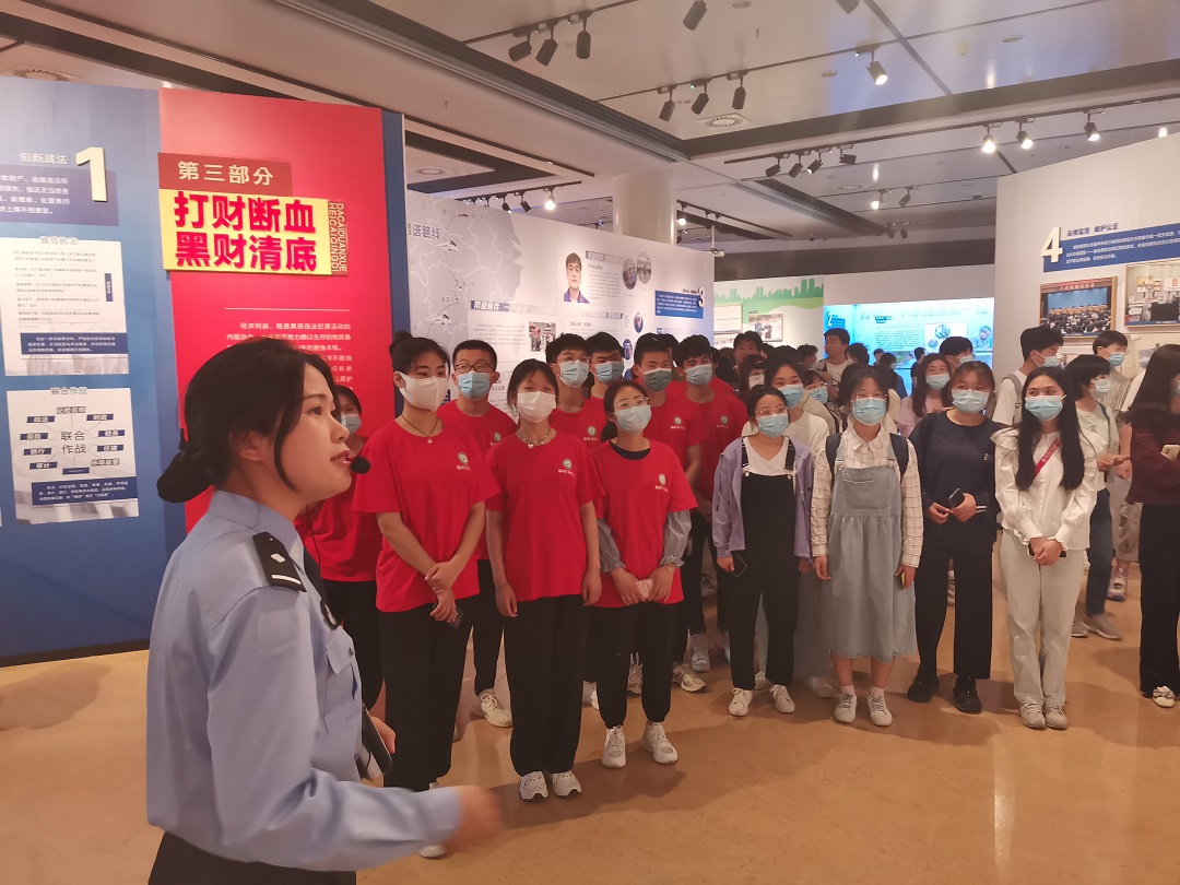 展览现场共分为“忠诚使命、奋勇担当”“重拳出击、剑指黑恶”“打财断血、黑财清底”“打伞破网、反腐拍蝇”“党建引领、强基固本”“行业整治、正本清源”“热血长城、英雄交响”“全面胜利、圆满收官”八个篇章,我省查处的涉黑涉恶案件、涉案财物、作案器具等扫黑除恶专项斗争丰硕成果,以视频、图片、实物等多种形式展现地淋漓尽致。同学们认真听取宣讲人员对我省扫黑除恶专项斗争成果的情况介绍,不时驻足细致观看,深刻认识到:黑恶势力是社会毒瘤,严重破坏经济社会秩序,侵蚀党的执政根基。