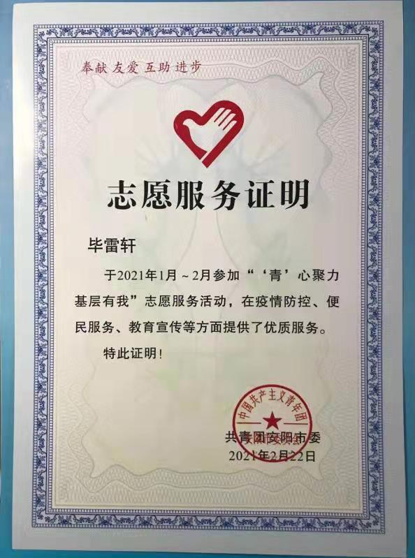 为切实增强新时代青年学生的使命感和责任感,把投身疫情防控作为共青团员彰显先进性的重要实践载体,河南共青团在全省部署开展“青”心聚力·基层有我——返乡大学生向社区(村)报到活动,组织动员广大返乡大学生落实以城市社区和行政村防控为主的综合防控措施,主动参与到城乡基层防护网络中,充分发挥共青团生力军和突击队作用。博彩游戏 学子毕雷轩的先进事迹受中国青年报等多家媒体宣传报道。