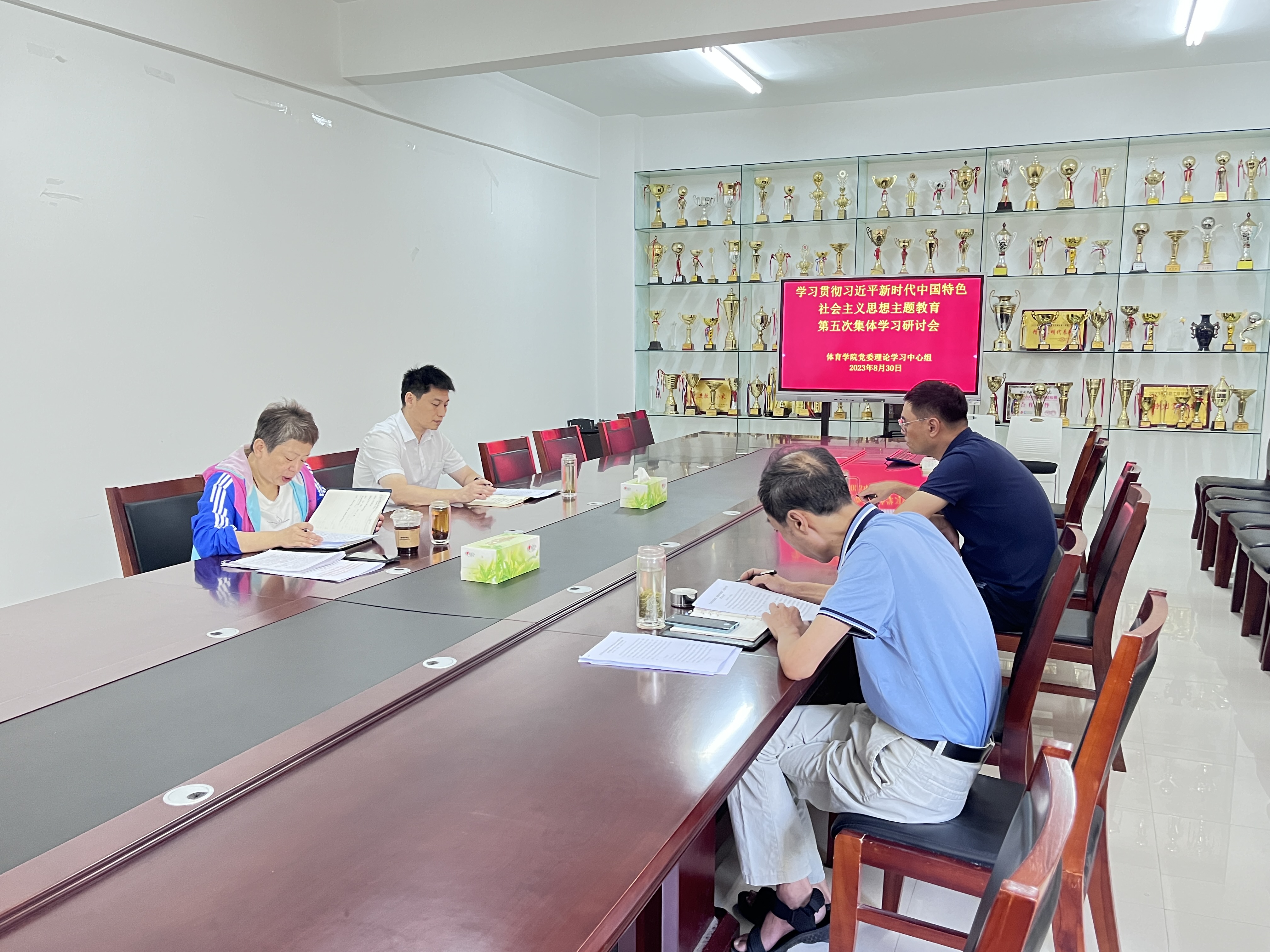 会议室召开学习贯彻习近平新时代中国特色社会主题教育第五次学习研讨会。会议由院党委书记吴旭静主持,在校院班子成员、院党委委员参加会议。