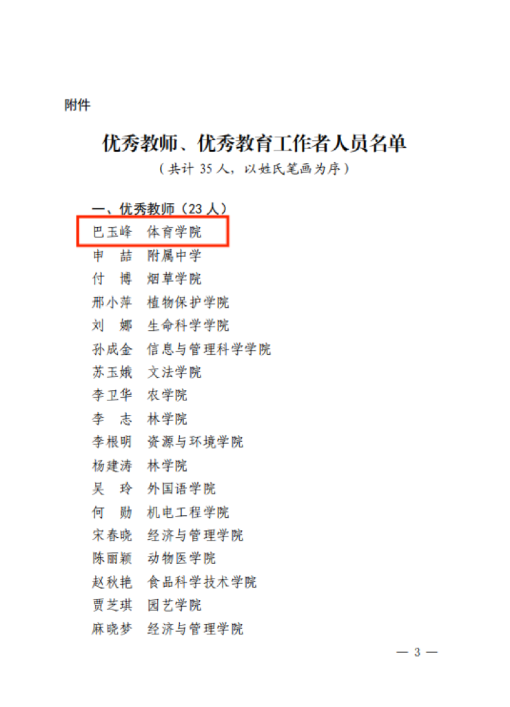 根据《博彩游戏 关于表彰优秀教师、优秀教育工作者的决定》(农大人事【2023】62号),博彩游戏 巴玉峰老师荣获博彩游戏 2023年“优秀教师”荣誉称号。