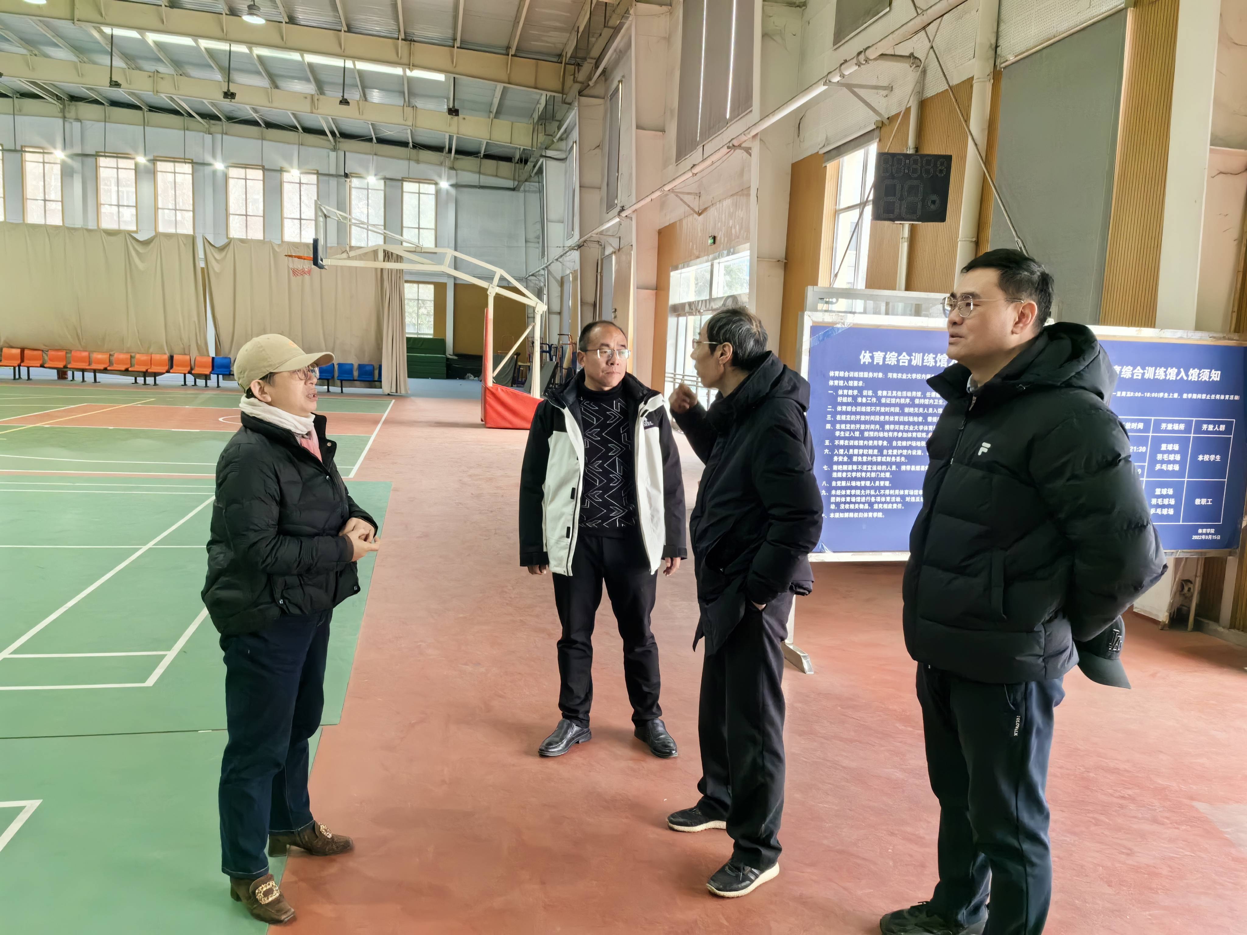 2024年2月23日下午在龙子湖校区东操场视察足球场、篮球场和排球场场地及相关器材的设备。排查了各类器材是否存在安全隐患。随后前往训练馆一楼,检查武术馆、舞蹈房、健身房等场地的环境、检查相关设备和器材的安全情况。在训练馆二楼视察室内篮球场、羽毛球场、乒乓球场等场馆的设备安全情况。让我们的老师和学生能够拥有良好的上课环境。2024年2月24日上午在文化路校区体育馆进行安全检查,排查水电安全及场馆顶棚等安全情况。