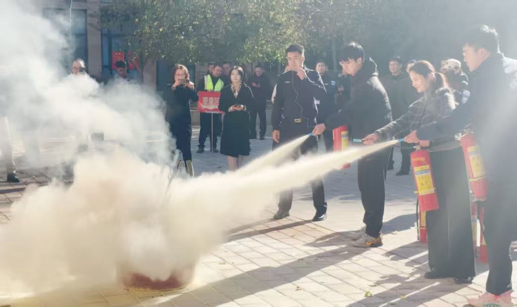 领导带头参与,教师们踊跃上前,在教员的专业指导下,熟练掌握了灭火器等消防器材的“提、拔、握、压”使用技巧,并积极参与了模拟火源的扑救实践。