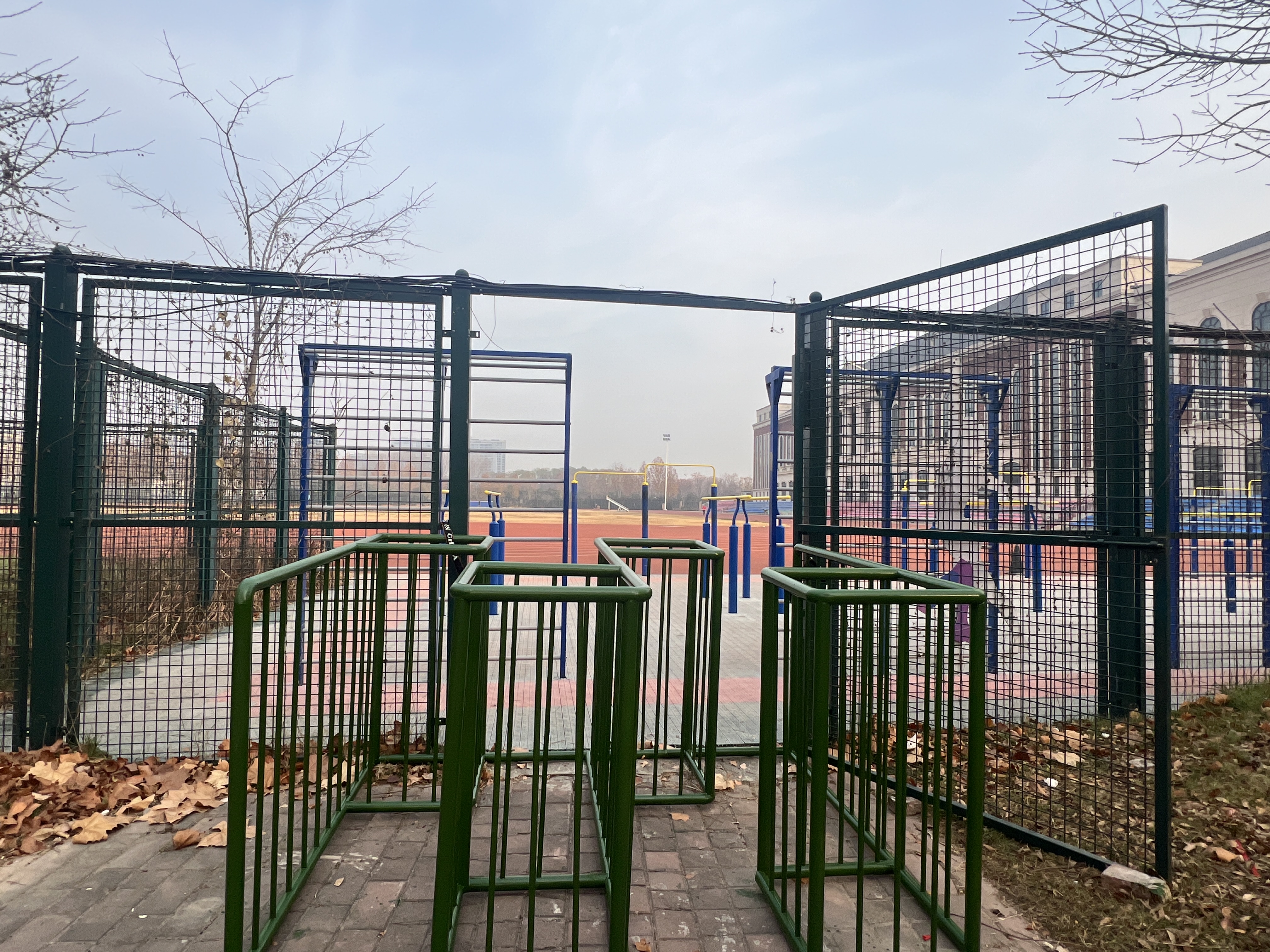 现场施工紧扣安全实用原则,重点完成两处进出口新建及配套设施布设:在体育场单双杠高频使用区域,建成宽度1.5-2米的人行通道并配备智能闸机;在田径场西北角临近停车场位置,建成宽度3米的综合通道及闸机系统,同步完成通道及衔接停车场区域的路面硬化工程,兼顾通行效率与安全保障。