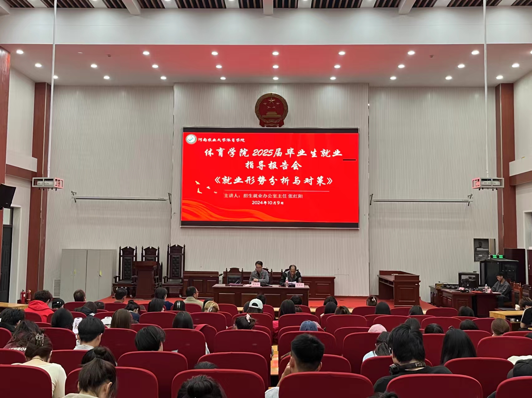 于龙子湖校区模拟法庭举办“就业形势分析与对策”报告会,特邀校招生就业办公室主任张红阳进行报告。院党委书记吴旭静、院长唐大鹏、院团委书记黄妍及2021级全体学生参加了会议。大会由副院长宛新生主持。
